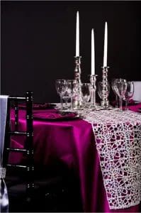 Table decoration and linens. If your venue provides your basic linens in white or ivory, (which many venues do), and you’d like to spice things up. We are here to help. Incorporating your theme at the table is very eye catching. One great way to start is by adding a runner. Runners are usually 12” wide and about 108” long. They are set in the middle of each table but can also be used in twos criss-crossing each other. Click here for samples. Table Runners usually come in polyester, long for POLY but many other colorful designs and fabrics available. One of which is organza, a sheer and very light weight fabric. Because of it being so sheer, this organza runner might not give you that color “pop” for your table display that you are looking for.