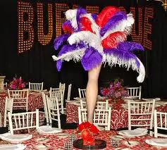 Moulin Rouge, is another one our favorite theme décor ideas for your gala or your black tie event. Moulin Rouge is a cabaret in Paris, France, known for their ballroom dancing, impressive costumes and theatrical floor acts. This theme uses a deep red and black color scheme base with a lots of overhead lighting fixtures to illuminate the floor. In this case using amber or so called white lights will work best in adding ambiance to your venue. Event if your venue is simple, using up lighting will transform it from plain to amazing. Also choosing a venue or a party room with a nice stage is also important for a live act or dance performers as a form of entertainment for the whole Moulin Rouge theme experience. Transporting your audience, guests to 1889 Paris Olympia. Having a red carpet entrance is a great start. It welcomes your guests and they anticipate the surprise. Entrance to your elegant should be draped in red velour Austrian Drape. The table cloth and linens can be a combination of red and black linens as well as napkins accenting the table top décor. Considering only the two colors red and black can be challenging, feel free to add a third color, for instance a gold or a silver to you themed décor. Even hot pink and purple can add an extra “POP” to your venue.